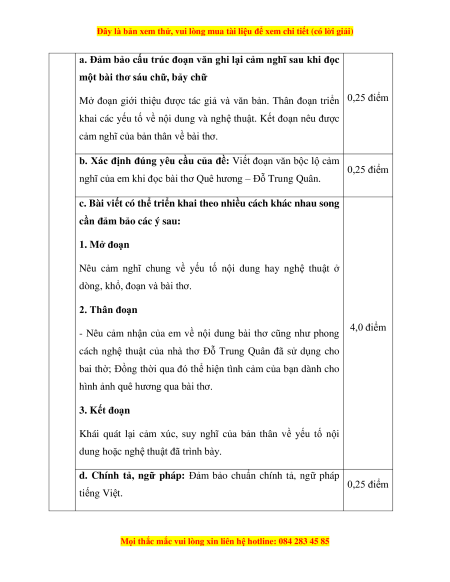 Hãy viết đoạn văn bộc lộ cảm nghĩ của em sau khi đọc bài thơ Quê hương của Đỗ Trung Quân. HƯỚNG DẪN CHẤM