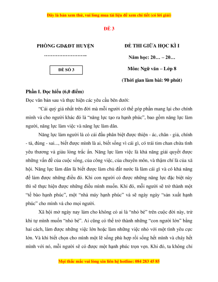 Đề thi giữa kì 1 Ngữ văn 8 Chân trời sáng tạo (đề 3)