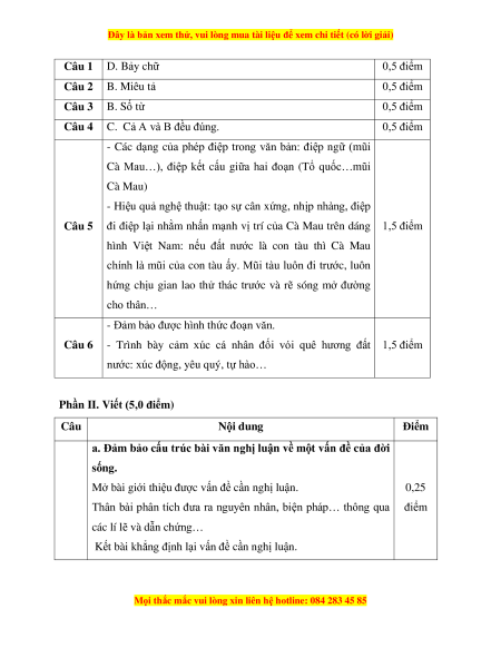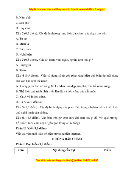 Câu 1 D. Bảy chữ 0,5 điểm Câu 2 B. Miêu tả 0,5 điểm Câu 3 B. Số từ 0,5 điểm Câu 4