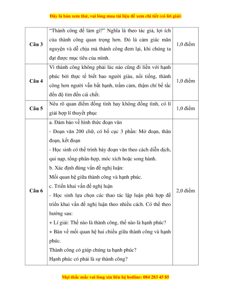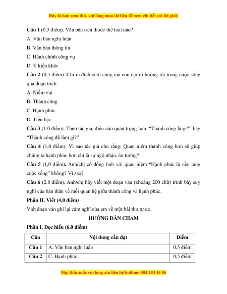 Câu 1 A. Văn bản nghị luận 0,5 điểm Câu 2 C. Hạnh phúc 0,5 điểm