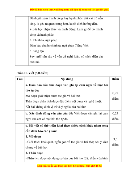 Viết đoạn văn ghi lại cảm nghĩ của em về một bài thơ tự do. HƯỚNG DẪN CHẤM