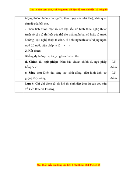 Lưu ý: Chỉ ghi điểm tối đa khi thí sinh đáp ứng đủ các yêu cầu