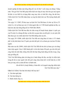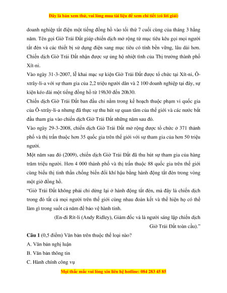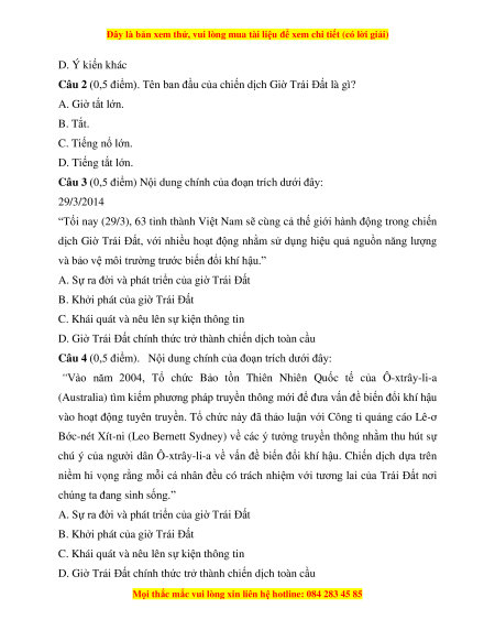 Câu 2 (0,5 điểm). Tên ban đầu của chiến dịch Giờ Trái Đất là gì? A. Giờ tắt lớn. B. Tắt. C. Tiếng nổ lớn. D. Tiếng tắt lớn.