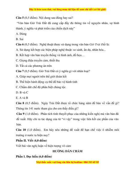 Câu 6 (0,5 điểm). Nghệ thuật được sử dụng trong văn bản Giờ Trái Đất là: