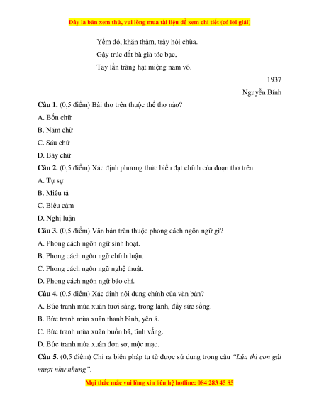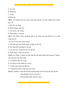 Câu 1. (0,5 điểm) Bài thơ trên thuộc thể thơ nào? A. Bốn chữ B. Năm chữ C. Sáu chữ D. Bảy chữ