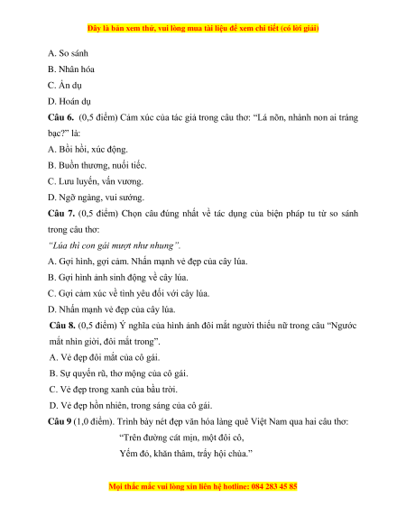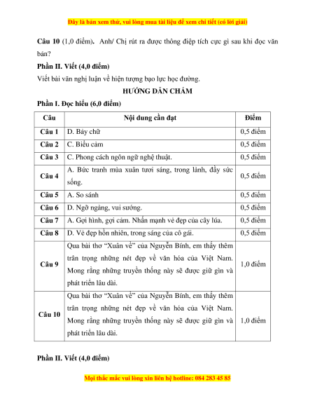 A. Bức tranh mùa xuân tươi sáng, trong lành, đầy sức Câu 4 0,5 điểm sống. Câu 5 A. So sánh 0,5 điểm Câu 6