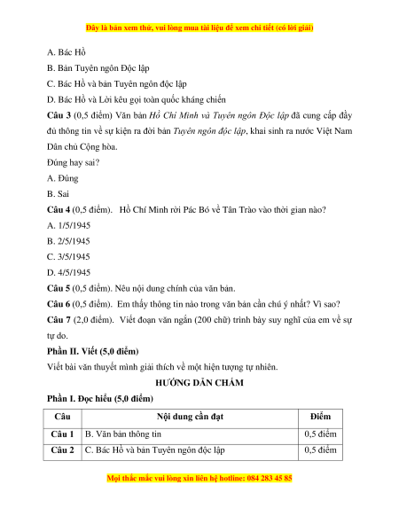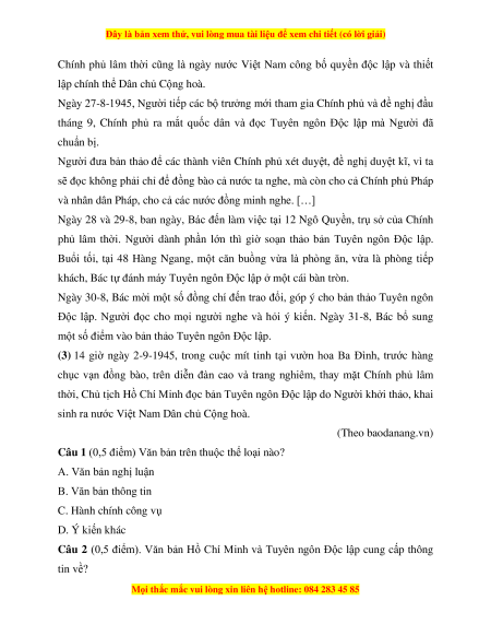 Câu 2 (0,5 điểm). Văn bản Hồ Chí Minh và Tuyên ngôn Độc lập cung cấp thông tin về?