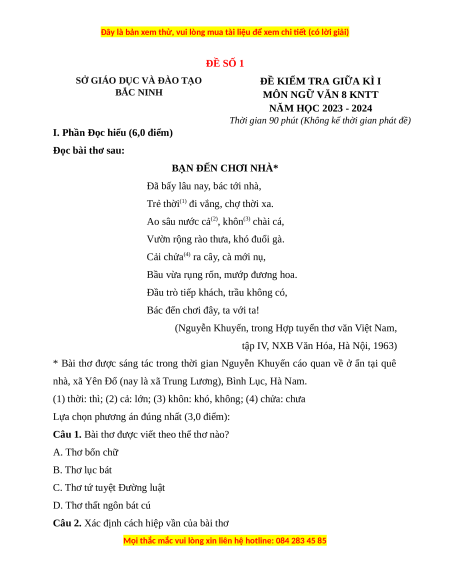 ĐỀ KIỂM TRA GIỮA KÌ I BẮC NINH MÔN NGỮ VĂN 8 KNTT NĂM HỌC 2023 - 2024