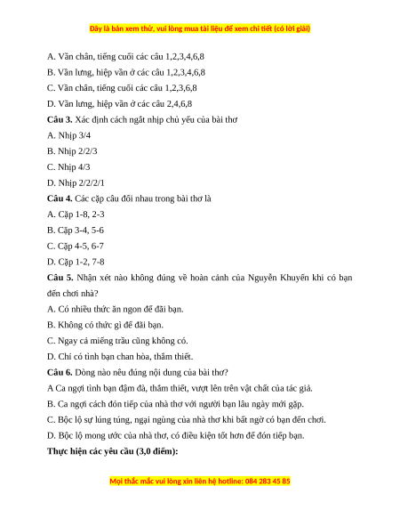 Câu 3. Xác định cách ngắt nhịp chủ yếu của bài thơ A. Nhịp 3/4 B. Nhịp 2/2/3 C. Nhịp 4/3 D. Nhịp 2/2/2/1