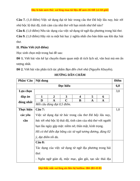 Đề 2. Viết bài văn phân tích tác phẩm Bạn đến chơi nhà (Nguyễn Khuyến). HƯỚNG DẪN CHẤM Phần/ Câu Nội dung Điểm Đọc hiểu 6,0 Lựa chọn 3,0 đáp án 1 2 3 4 5 6 đúng nhất D A C B A A