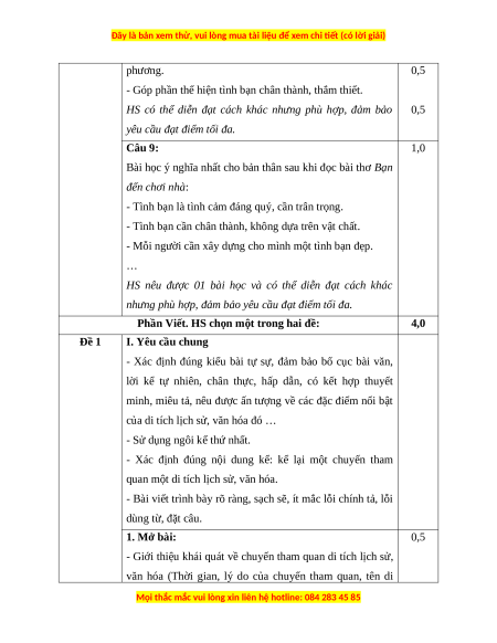 yêu cầu đạt điểm tối đa. Câu 9: 1,0