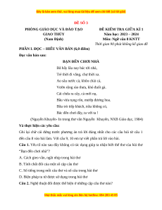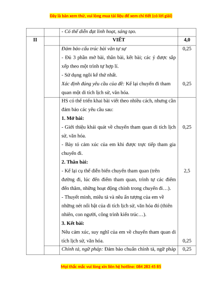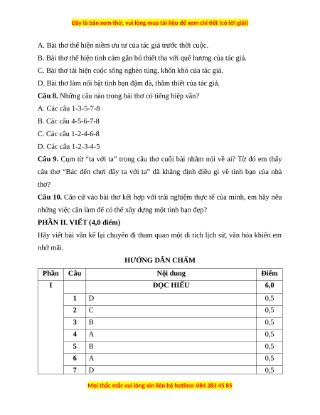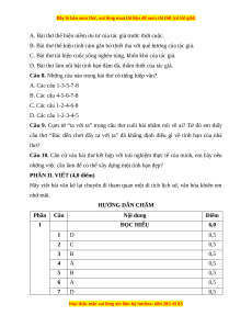 Hãy viết bài văn kể lại chuyến đi tham quan một di tích lịch sử, văn hóa khiến em nhớ mãi. HƯỚNG DẪN CHẤM Phần Câu Nội dung Điểm I ĐỌC HIỂU 6,0 1 D 0,5 2 C 0,5 3 B 0,5 4 A 0,5 5 B 0,5 6 A 0,5 7 D 0,5