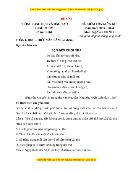 Năm học: 2023 – 2024 (Nam Định) Môn: Ngữ văn 8 KNTT
