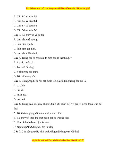 Câu 7. Câu nào sau đây khái quát đúng nội dung của bài thơ?