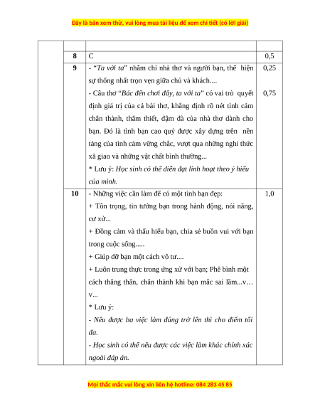 * Lưu ý: Học sinh có thể diễn đạt linh hoạt theo ý hiểu của mình. 10