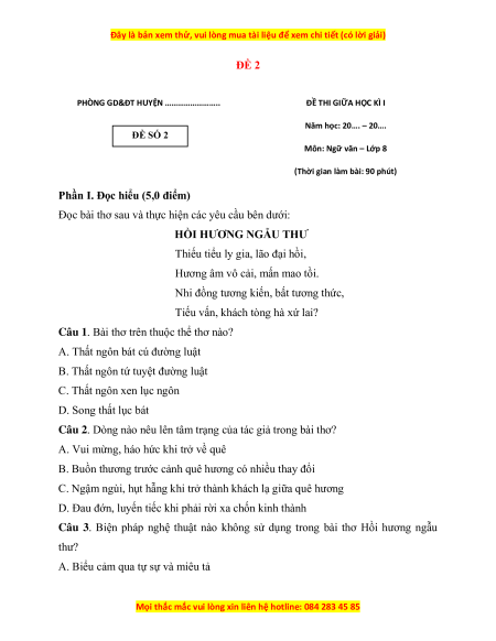 Đề thi giữa kì 1 Ngữ văn 8 Kết nối tri thức (đề 2)