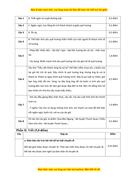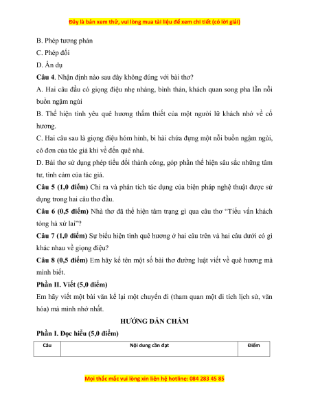 C. Ngậm ngùi, hụt hẫng khi trở thành khách lạ giữa quê hương 0,5 điểm Câu 3 D. Ẩn dụ 0,5 điểm