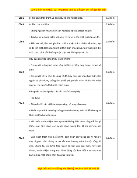B. Tìm cách trốn tránh và đùn đẩy nó cho người khác. 0,5 điểm Câu 4 A. Tính trách nhiệm 0,5 điểm