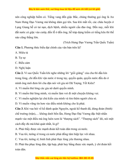 Câu 1. Phương thức biểu đạt chính của văn bản trên là? A. Miêu tả B. Tự sự C. Biểu cảm D. Nghị luận