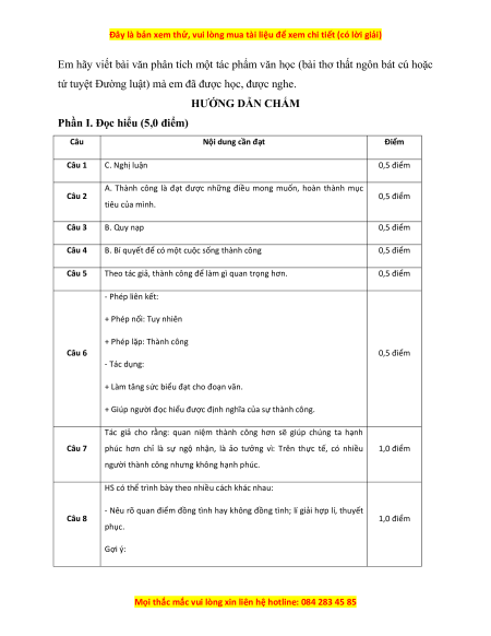 Theo tác giả, thành công để làm gì quan trọng hơn. 0,5 điểm - Phép liên kết: + Phép nối: Tuy nhiên + Phép lặp: Thành công Câu 6 0,5 điểm - Tác dụng: