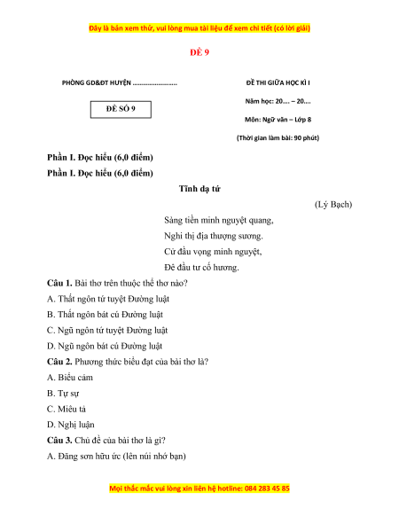 Phần I. Đọc hiểu (6,0 điểm) Tĩnh dạ tứ (Lý Bạch)