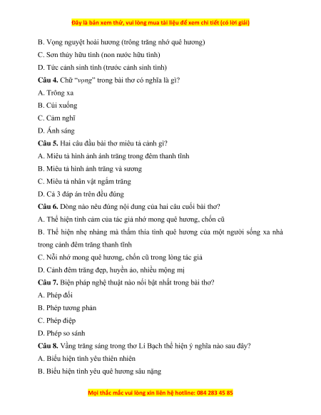 Câu 4. Chữ “vọng” trong bài thơ có nghĩa là gì? A. Trông xa B. Cúi xuống C. Cảm nghĩ D. Ánh sáng