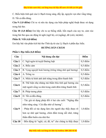 B. Vọng nguyệt hoài hương (trông trăng nhớ quê hương) 0,5 điểm Câu 4 A. Trông xa 0,5 điểm Câu 5