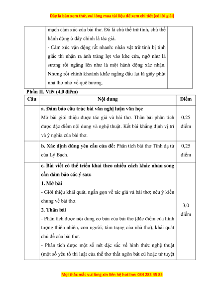 b. Xác định đúng yêu cầu của đề: Phân tích bài thơ Tĩnh dạ tứ 0,25 của Lý Bạch. điểm