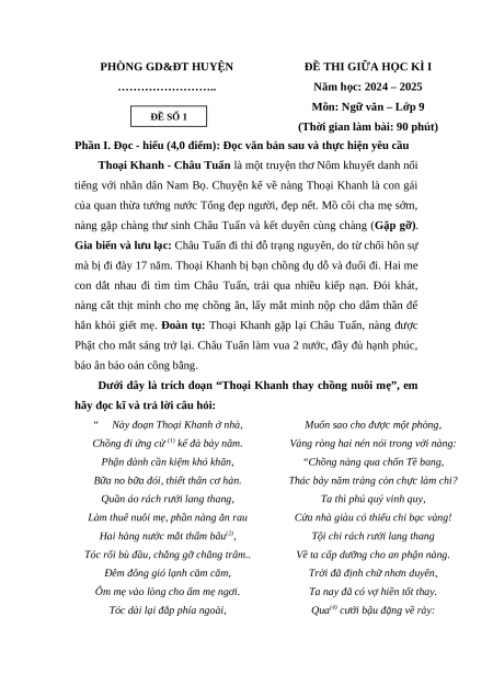 Môn: Ngữ văn – Lớp 9 ĐỀ SỐ 1