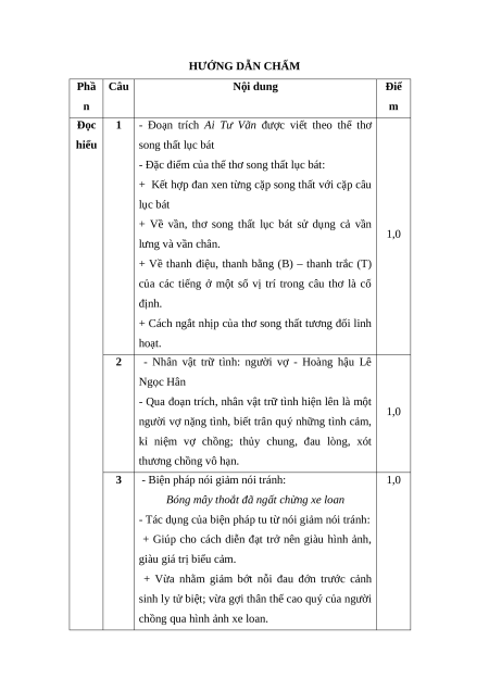đoạn trích trong Ai Tư vãn của Lê Ngọc Hân ở phần Đọc - hiểu. HƯỚNG DẪN CHẤM Phầ Câu Nội dung Điể n m Đọc 1