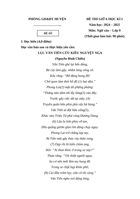 Đề thi giữa kì 1 Ngữ văn 9 Cánh diều 2024 (Đề 5)