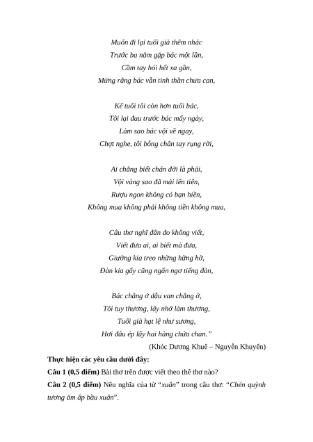 Câu 2 (0,5 điểm) Nêu nghĩa của từ “xuân” trong câu thơ: “Chén quỳnh