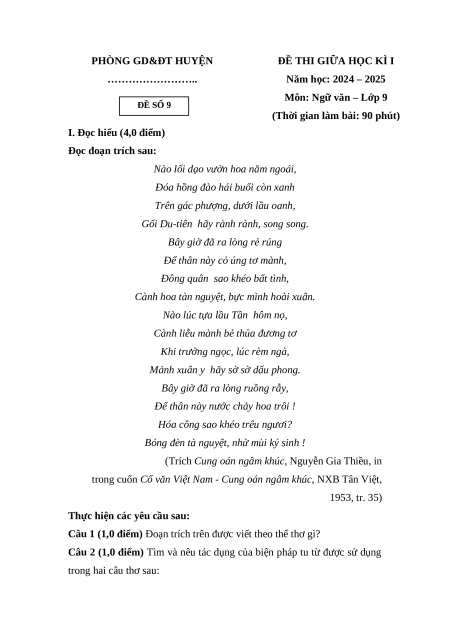 Môn: Ngữ văn – Lớp 9 ĐỀ SỐ 9