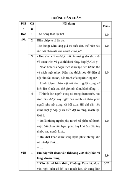 khúc” của tác giả Nguyễn Gia Thiều (trích dẫn trong phần đọc hiểu). HƯỚNG DẪN CHẤM Phầ Câ Nội dung Điểm n u Đọc 1 Thơ Song thất lục bát 1,0 hiểu 2