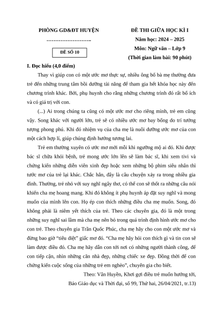 Môn: Ngữ văn – Lớp 9 ĐỀ SỐ 10