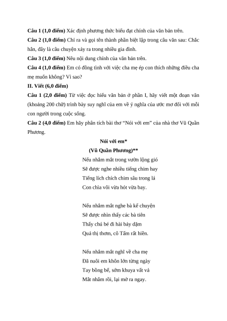 Câu 2 (4,0 điểm) Em hãy phân tích bài thơ “Nói với em” của nhà thơ Vũ Quần Phương. Nói với em* (Vũ Quần Phương)**