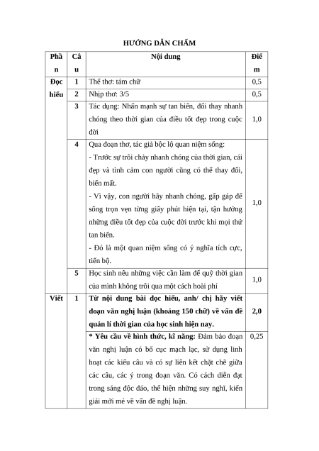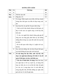 (Áo cũ - Lưu Quang Vũ, Thơ tình, NXB Văn học, 2002) HƯỚNG DẪN CHẤM Phầ Câ Nội dung Điể n u m Đọc 1 Thể thơ: tám chữ 0,5 hiểu 2 Nhịp thơ: 3/5 0,5 3