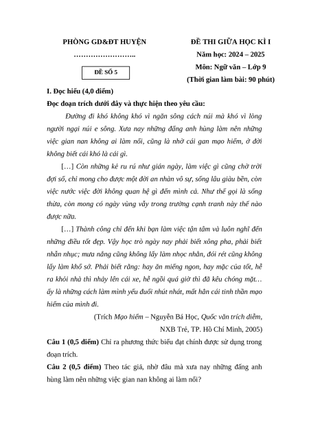 Môn: Ngữ văn – Lớp 9 ĐỀ SỐ 5