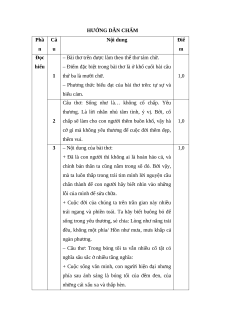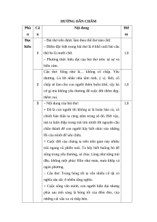 Câu 2 (4,0 điểm) Anh (chị) hãy viết đoạn văn nêu cảm nghĩ về bài thơ ở phần đọc hiểu. HƯỚNG DẪN CHẤM Phầ Câ Nội dung Điể n u m Đọc