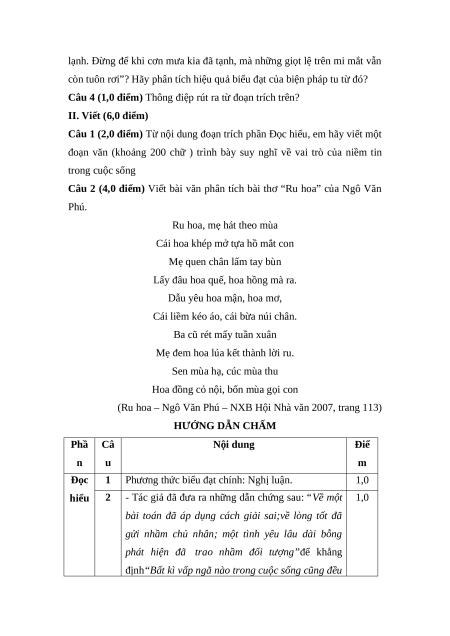 (Ru hoa – Ngô Văn Phú – NXB Hội Nhà văn 2007, trang 113) HƯỚNG DẪN CHẤM Phầ Câ Nội dung Điể n u m Đọc 1