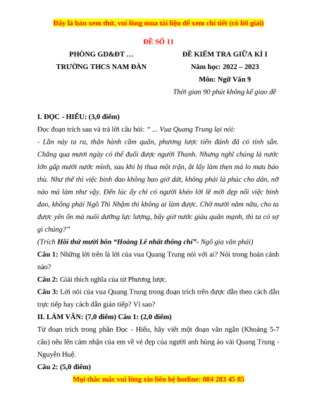 Đề thi giữa kì 1 Ngữ văn 9 - Đề 11