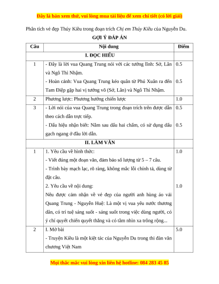 Phân tích vẻ đẹp Thúy Kiều trong đoạn trích Chị em Thúy Kiều của Nguyễn Du. GỢI Ý ĐÁP ÁN Câu Nội dung Điểm I. ĐỌC HIỂU 1