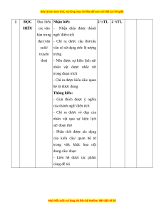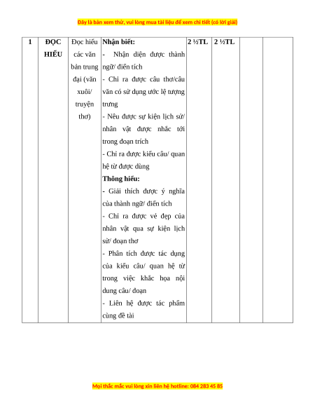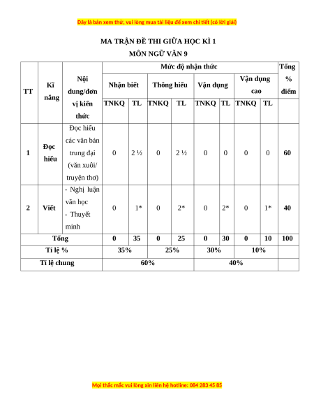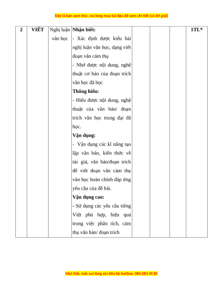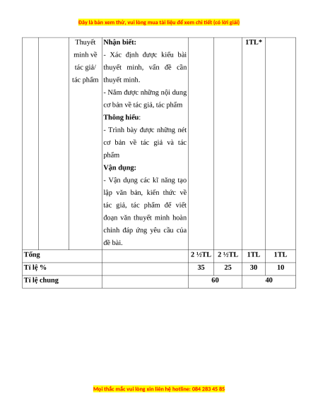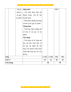 Mức độ nhận thức Tổng Nội Vận dụng % Kĩ Nhận biết Thông hiểu Vận dụng TT dung/đơn cao điểm năng vị kiến TNKQ TL TNKQ TL TNKQ TL TNKQ TL thức Đọc hiểu các văn bản Đọc 1 trung đại 0 2 ½ 0 2 ½ 0 0 0 0 60 hiểu (văn xuôi/ truyện thơ) - Nghị luận văn học 2 Viết 0 1* 0 2* 0 2* 0 1* 40 - Thuyết minh Tổng 0 35 0 25 0 30 0 10 100 Tỉ lệ % 35% 25% 30% 10% Tỉ lệ chung 60% 40%