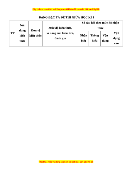 BẢNG ĐẶC TẢ ĐỀ THI GIỮA HỌC KÌ 1