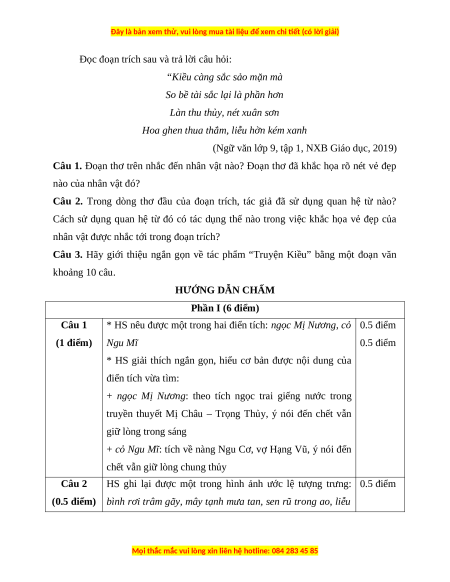 Câu 3. Hãy giới thiệu ngắn gọn về tác phẩm “Truyện Kiều” bằng một đoạn văn khoảng 10 câu. HƯỚNG DẪN CHẤM Phần I (6 điểm) Câu 1