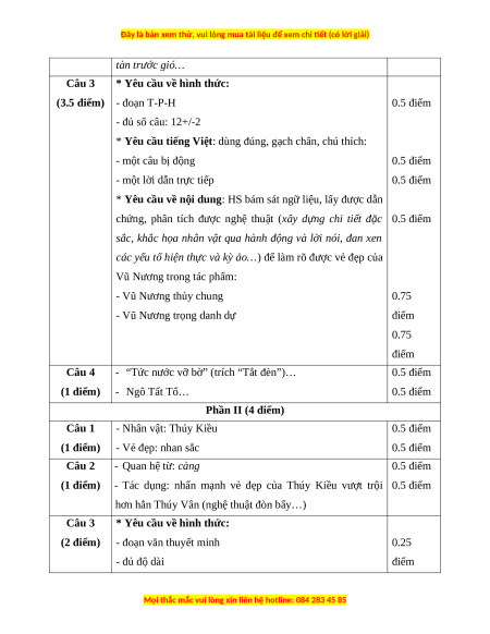 - “Tức nước vỡ bờ” (trích “Tắt đèn”)… 0.5 điểm (1 điểm) - Ngô Tất Tố… 0.5 điểm Phần II (4 điểm) Câu 1 - Nhân vật: Thúy Kiều 0.5 điểm (1 điểm) - Vẻ đẹp: nhan sắc 0.5 điểm Câu 2 - Quan hệ từ: càng 0.5 điểm (1 điểm)
