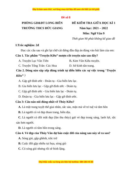Đề thi giữa kì 1 Ngữ văn 9 - Đề 8