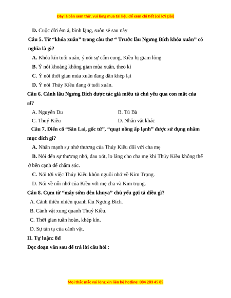 D. Sự tàn tạ của cảnh vật. II. Tự luận: 8đ