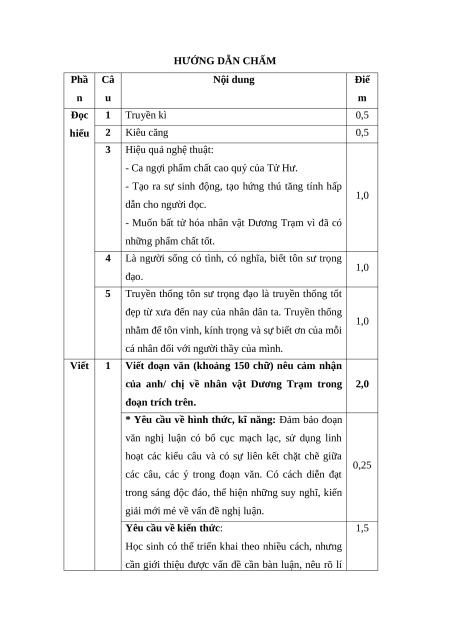 trách nhiệm của con người với môi trường. HƯỚNG DẪN CHẤM Phầ Câ Nội dung Điể n u m Đọc 1 Truyền kì 0,5 hiểu 2 Kiêu căng 0,5 3 Hiệu quả nghệ thuật:
