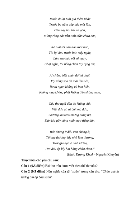 Câu 1 (0,5 điểm) Bài thơ trên được viết theo thể thơ nào?